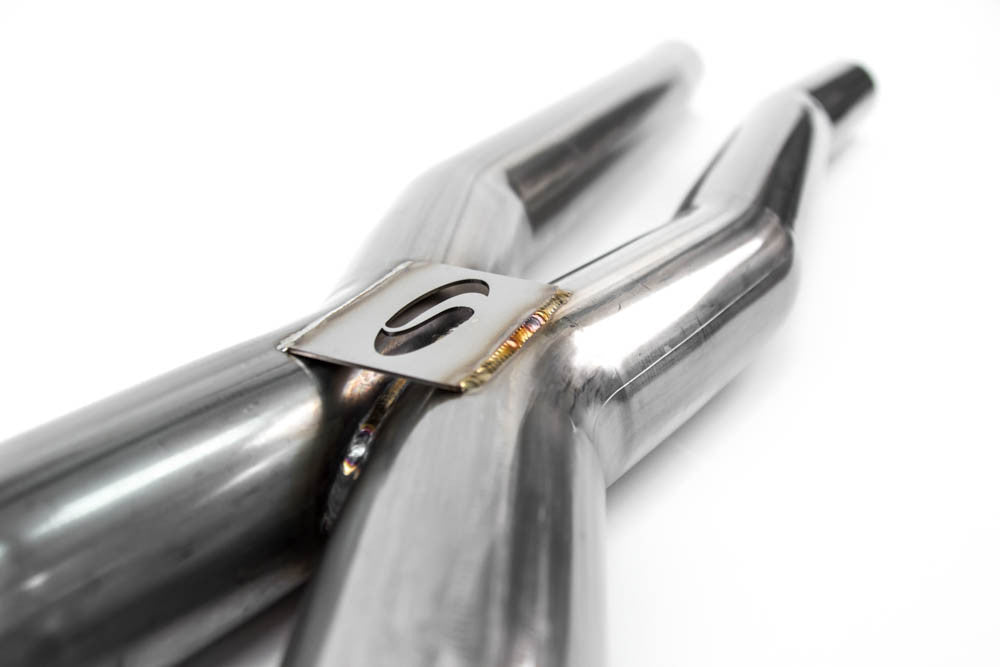 Steeda's 304SS Resonator Delete X-Pipe for your 2015-2026 5.0L, Coyote powered S550/S650 Ford Mustang GT is the best way to improve sound and increase performance at minimal cost, all while losing up to 7 pounds of weight. The X design, with its smooth transition, creates more scavenging effect than traditional H designs for increased power at high RPMs and a race inspired exhaust note. Unlike most versions on the market, this X-pipe allows you to retain the factory heat shield found on 2018 and newer GT models without cutting and expanding the X-pipe to retain the OE shields or chiseling off the OE shields. With mandrel bent 2.5"diameter tubing, the X-pipe easily installs between the factory catalytic converters and the factory mufflers. It is also compatible with virtually all aftermarket axle back exhaust kits. The T-304 stainless steel mandrel bent tubing will not develop surface rust typical with 409 stainless or rust completely through like aluminized mild steel. The flush fit exhaust clamps allow for shortening of the X-pipe if needed and prevent exhaust leaks common with expanded end kits.
